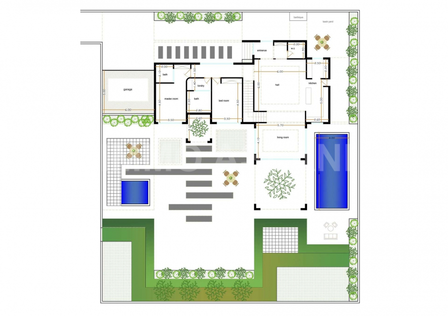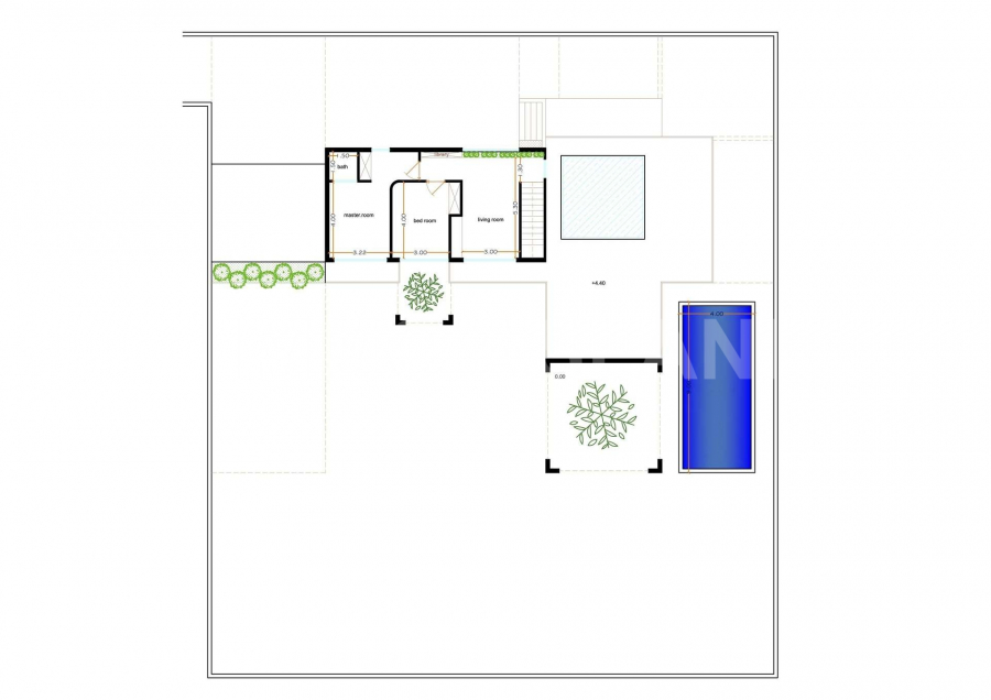 Das Grundstück ohne Zufahrt ist nahezu quadratisch (30 x 34 Meter).