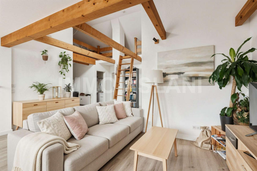Der zentrale Mittelpunkt der Wohnung ist der großzügige Wohn- und Essbereich mit offener Wohnküche. Der loftartige Atelier-Charakter, kombiniert mit viel Tageslicht, schafft ein modernes und zugleich einladendes Wohnambiente. Der direkt angrenzende sonnige Balkon erweitert den Wohnraum ins Freie und bietet einen angenehmen Rückzugsort über den Dächern der Stadt.